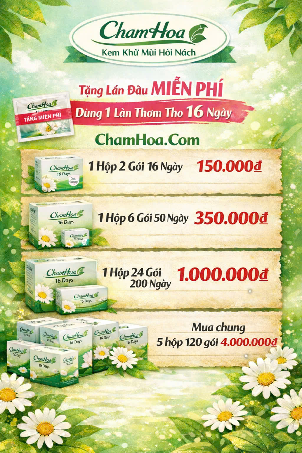 ChamHoa 16 Days là kem hỗ trợ khử mùi vùng da dưới cánh tay, được thiết kế dạng gói nhỏ tiện lợi, giúp chăm sóc cơ thể sạch mùi và thoải mái trong thời gian dài.